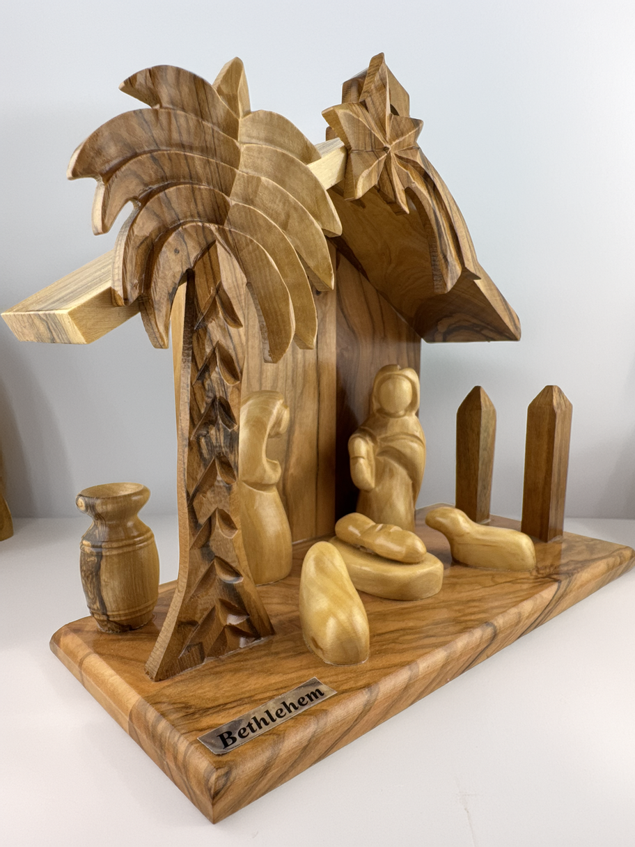 ● Hand-Carved from Genuine Olive Wood – Sustainably sourced and carved in Bethlehem ● Fixed, Faceless Figurines – Includes Baby Jesus, Mary, Joseph, and other key figures securely attached ● Minimalist Design – Faceless style promotes simplicity and universality of the Christmas message ● One-Piece Construction – Easy to display, move, and store with no setup required ● Made in the Holy Land – Crafted steps away from the birthplace of Jesus ● Ideal for Homes, Churches, or Gift Giving – A timeless and reverent piece for any space