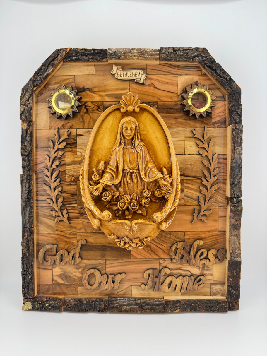 Hand-Carved Olive Wood Virgin Mary Plaque with Holy Relics – God Bless Our Home