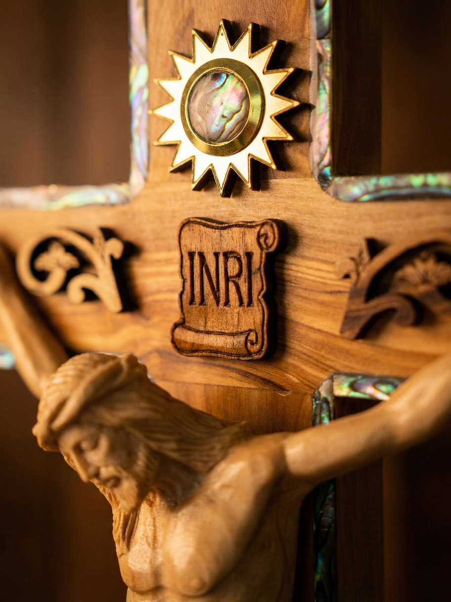 A beautifully handcrafted crucifix from the Holy Land, made of rich olive wood and inlaid with shimmering mother of pearl. At its center is a finely carved figure of Christ, showcasing skilled artisan detail—both a meaningful symbol of faith and a unique devotional treasure.