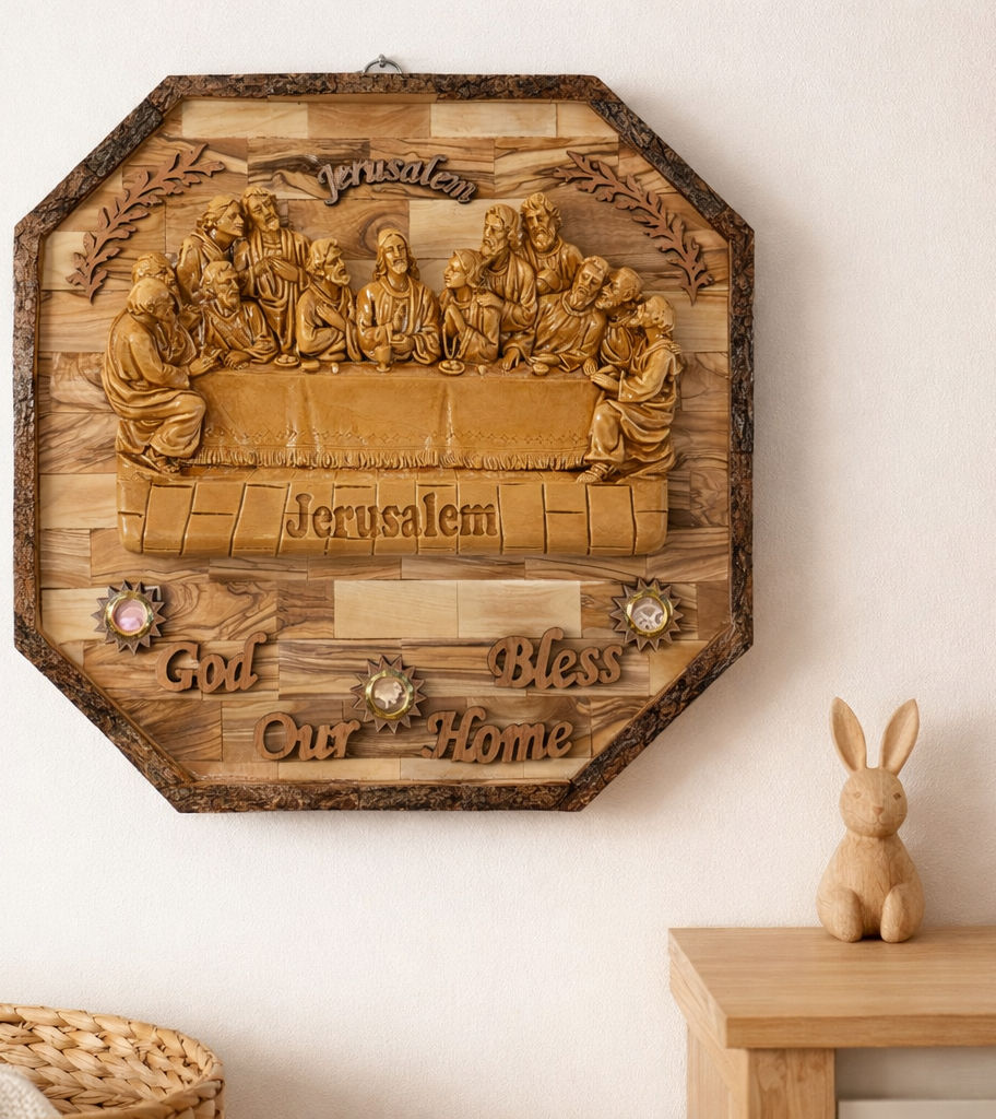 The natural grain of the olive wood gives every plaque a unique character, while the finely sculpted figures bring warmth, depth, and reverence to this timeless scene. The octagonal frame enhances its presence, making it a meaningful centerpiece for any home.